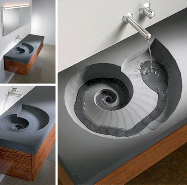 L’acqua segue l’effetto spirale prima di raggiungere lo scarico. Un lavabo particolare che allunga e nello stesso tempo accentua un processo apparentemente banale in modo dinamico ed elegante.